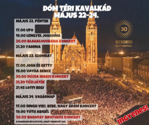 Összeállt a Dóm téri KAVALKÁD műsora, mely idén május 22-24. között, azaz a Szeged Napja Ünnepségsorozat első hétvégéjén kerül megrendezésre. Az esti ingyenes koncertek mellett