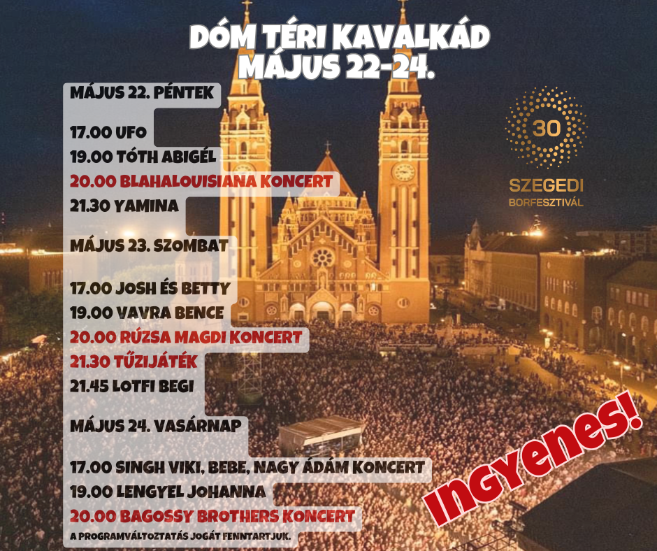 Összeállt a Dóm téri KAVALKÁD műsora, mely idén május 22-24. között, azaz a Szeged Napja Ünnepségsorozat első hétvégéjén kerül megrendezésre. Az esti ingyenes koncertek mellett